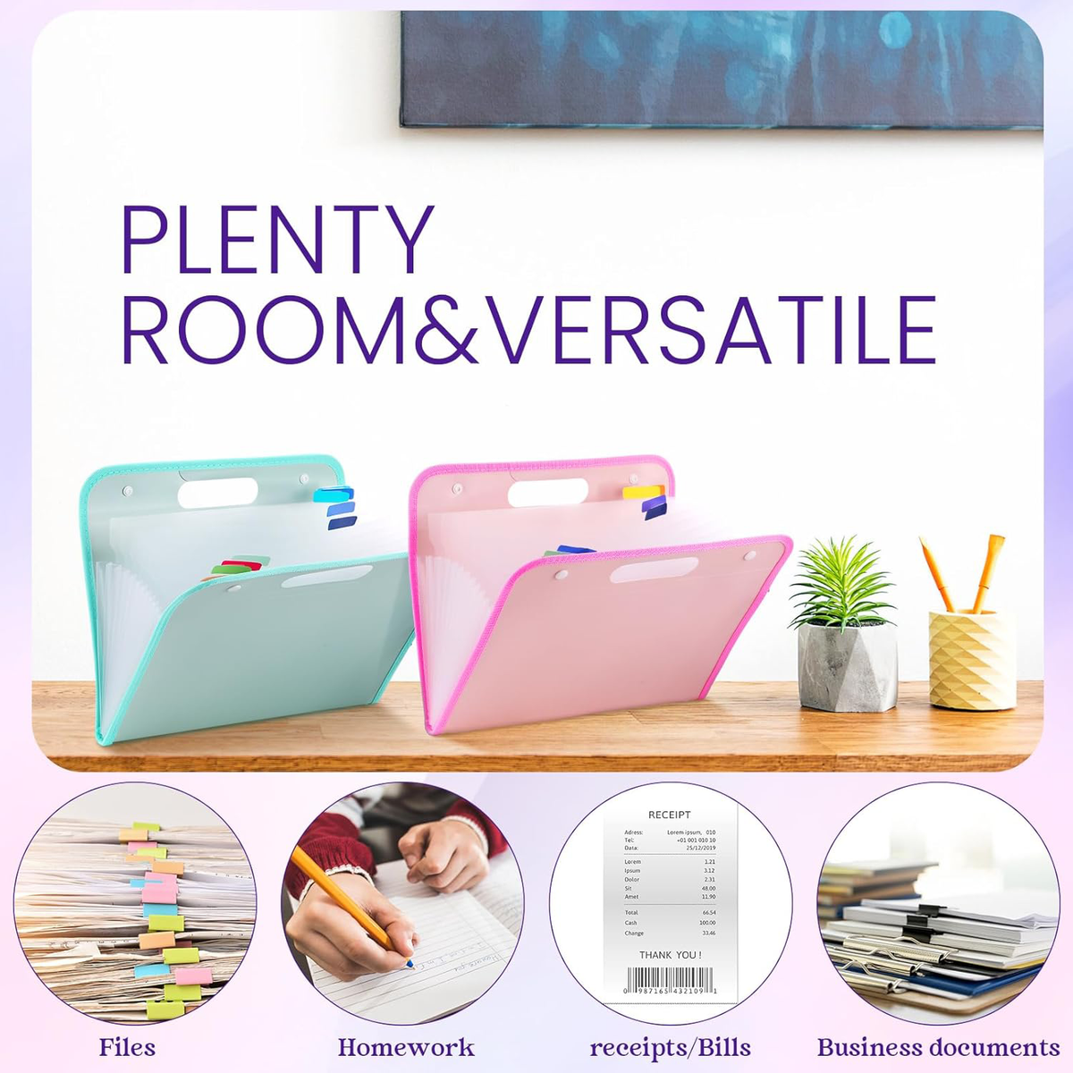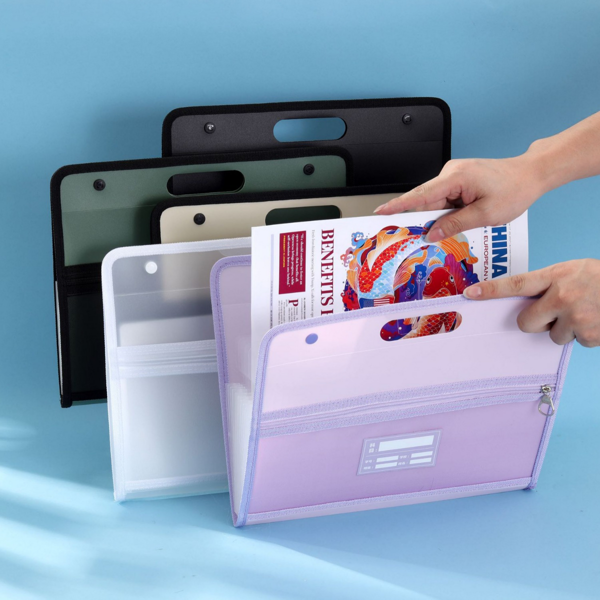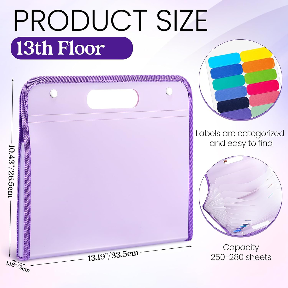 These expanding file folders come in a set of 4, each with 13 pockets and a large capacity for up to 280 A 4-sized pages. Made from durable PP plastic, they are tear-resistant and protect documents from wrinkling. Designed for easy organization, they include label stickers and a convenient handle for portability. The snap closure ensures secure storage, making them ideal for professionals, students, and anyone needing to organize large amounts of paper. Perfect for use in offices, schools.