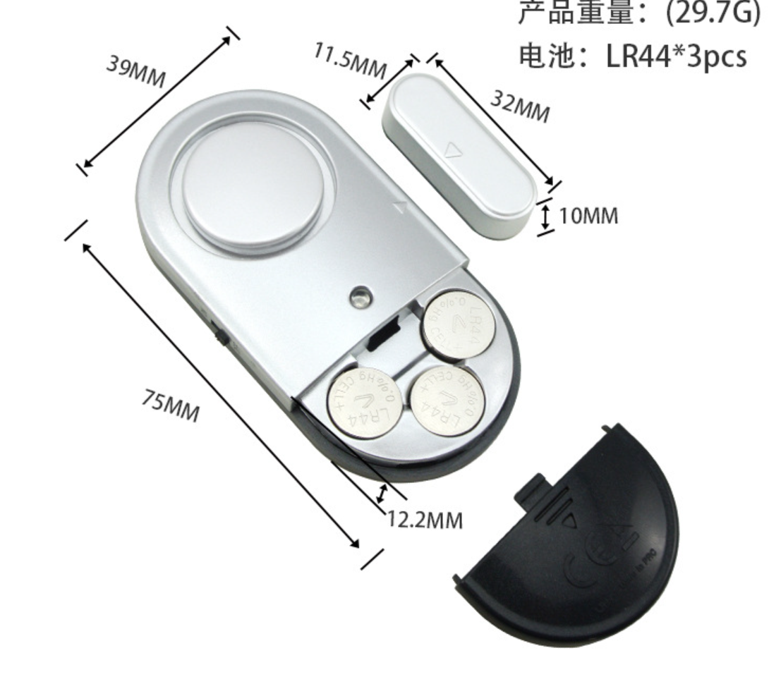 120DB large decibel door and window magnetic alarm is made of ABS, with three LR44 button batteries. Ultra-thin design, can be installed on any door and window. Always protect the safety of your family. Logo can be customized.