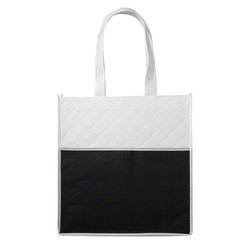 Get noticed with our stylish two-tone quilted pocket tote bag! Featuring a sleek diamond quilted pattern on the front pocket in black, this tote boasts two durable non-woven polyester handles measuring 20 inches in length. Perfect for groceries or daily essentials, it's both practical and fashionable. Add your company logo for effective promotion. Available in the USA.