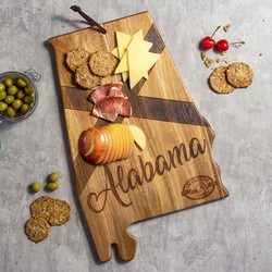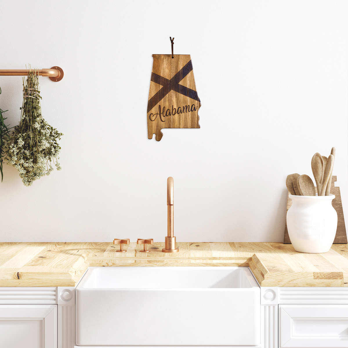 Celebrate your "sweet home" state with the Rock & Branch Origins Series Alabama State Shaped Cutting Board by Totally Bamboo! This beautifully crafted acacia wood cutting board is shaped in the unmistakable outline of Alabama. The board also features a bold, laser-engraved design featuring the state name and an homage to the flag. It's a fun way to add a bit of local "flavor" to your charcuterie platter when serving favorite meats, cheeses, fruits and breads to friends and family. The reverse side of the board is blank to use as a chopping board when prepping food. The Origins Series Board also includes a hang tie to easily double as wall art when not in use. It's a wonderful way to show off your love of Alabama in the kitchen, dining room, den or office. It also makes a great gift for anyone that's a fan of the state. The board is hand wash only, do not soak or wash in the dishwasher. Cutting board measures 10" x 15-3/4" x 5/8".