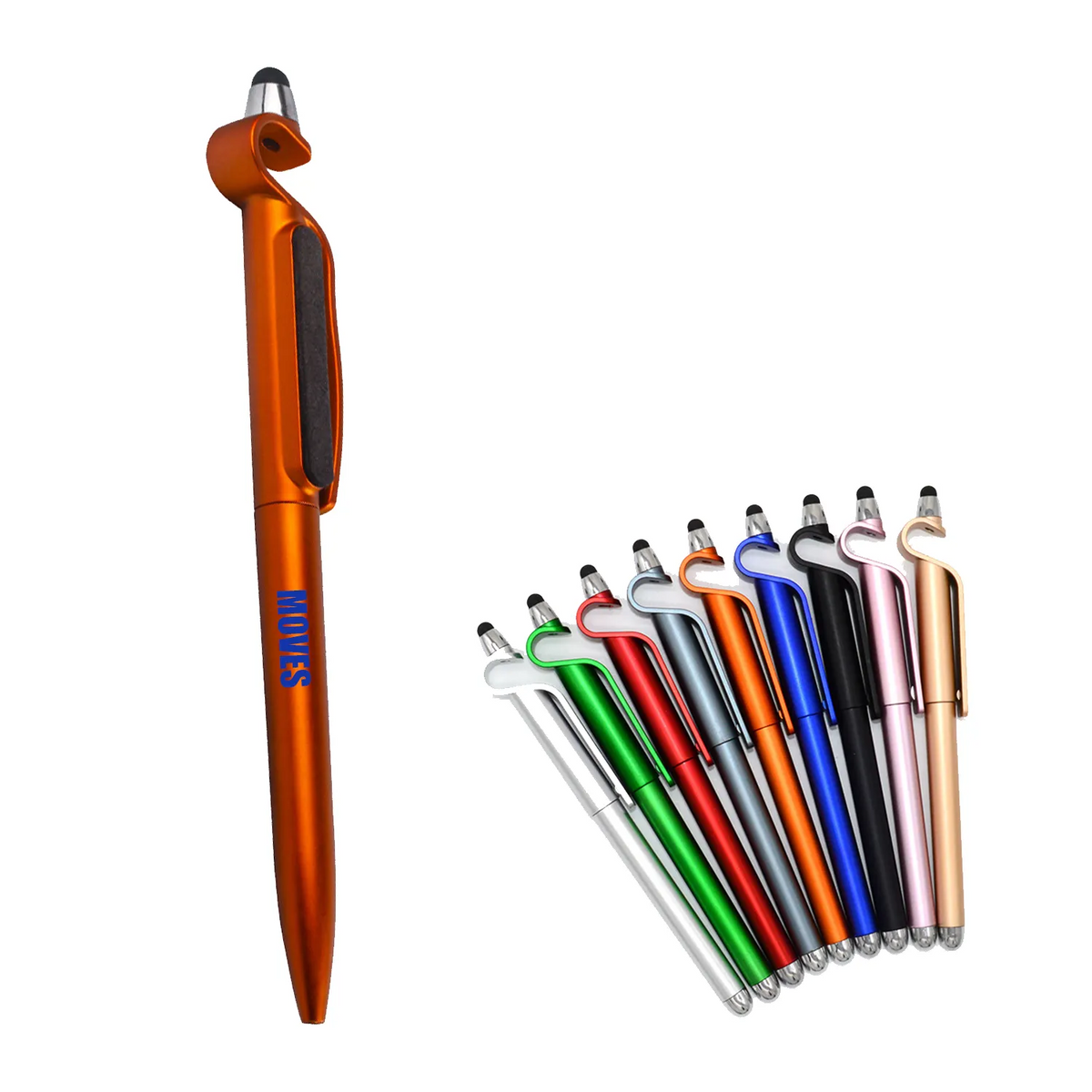 Unique designed Metallic Colored Barrels with Black Trim for an Elegant Look, Features a Responsive Stylus Point on Tip for All Smartphone and Tablet Devices! Also features a phone holder stand! This Popular 3-in 1 multi function pens will immediately become a hit at your upcoming trade shows!