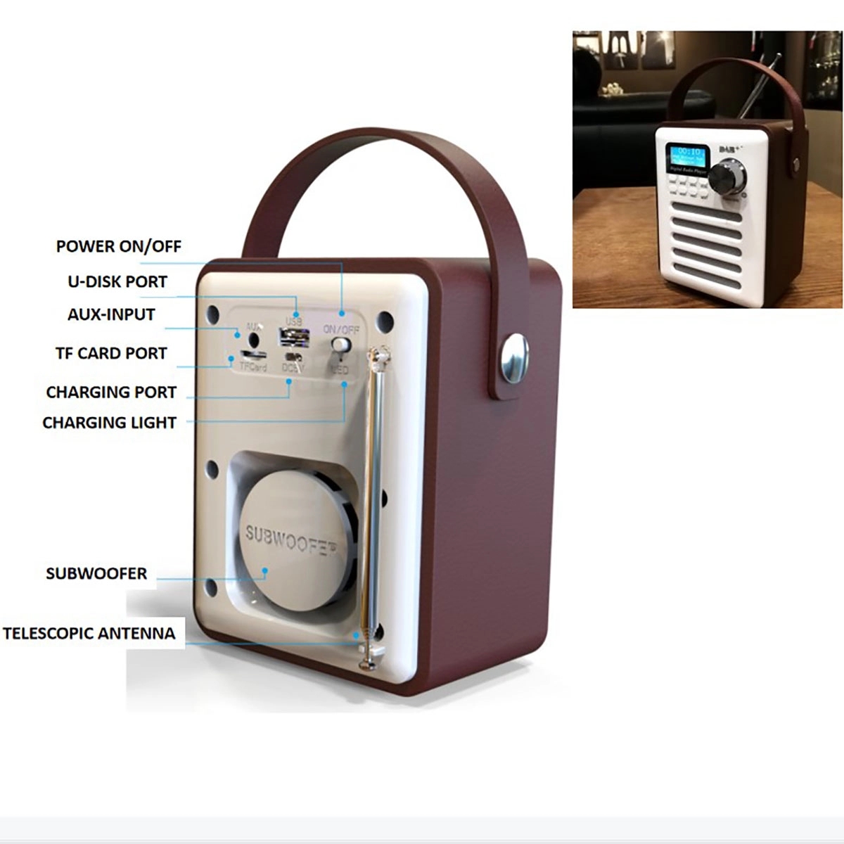 The device is a home-use all-in-one wireless DAB/DAB+ digital radio speaker, which integrates DAB, wireless, FM, Mp3 player, Aux .It made of wooden case to provide better sound quality.Custom logo welcomed, your ideal premium gifts for your famlies, freinds and great as business gifts!