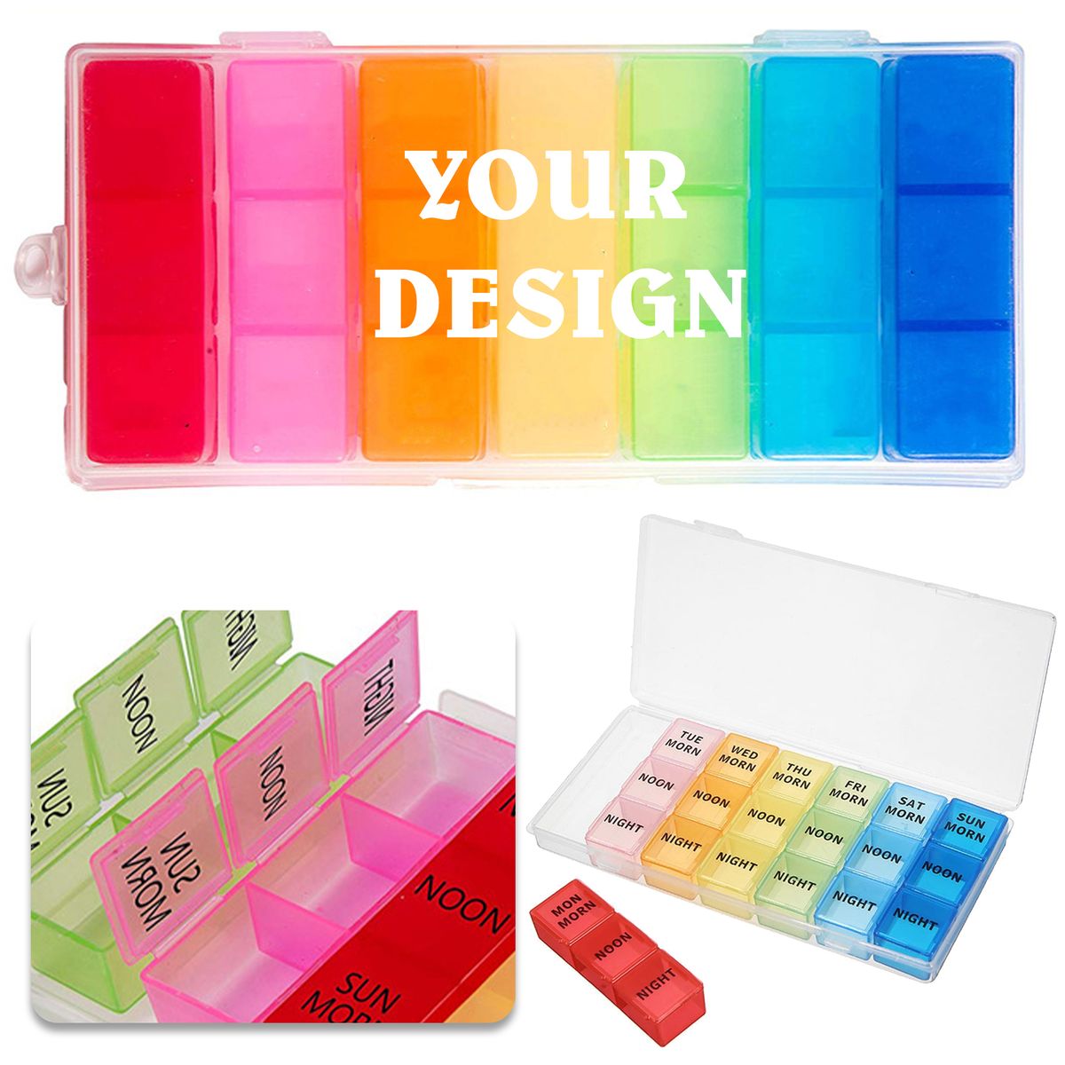 Food grade pp plastic,separate compartments constructed with durable molded BPA-free materials. Individually separated pill case,this pill box has 7 removable boxes and each box has 3 separate cubic compartments,smooth surface won't adsorb any residue, which avoids mixing former pills residue to current pills. We can customize logo with a variety of sizes and colors. 100% guarantee for quality. Rush Service.