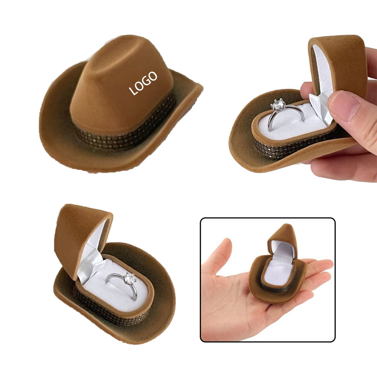 Present your treasures with a touch of frontier spirit. This creatively designed ring box, shaped like a classic Western hat, is crafted from durable nylon with a soft finish. A decorative band adds authentic detail. Inside, a plush lining securely cradles and protects a ring from scratches. Measuring 2.72x2.24x1.46 inches, it's perfectly portable for proposals, anniversaries, or as unique branding packaging. Elevate your presentation and make moments unforgettable. Contact us for a free quote today!