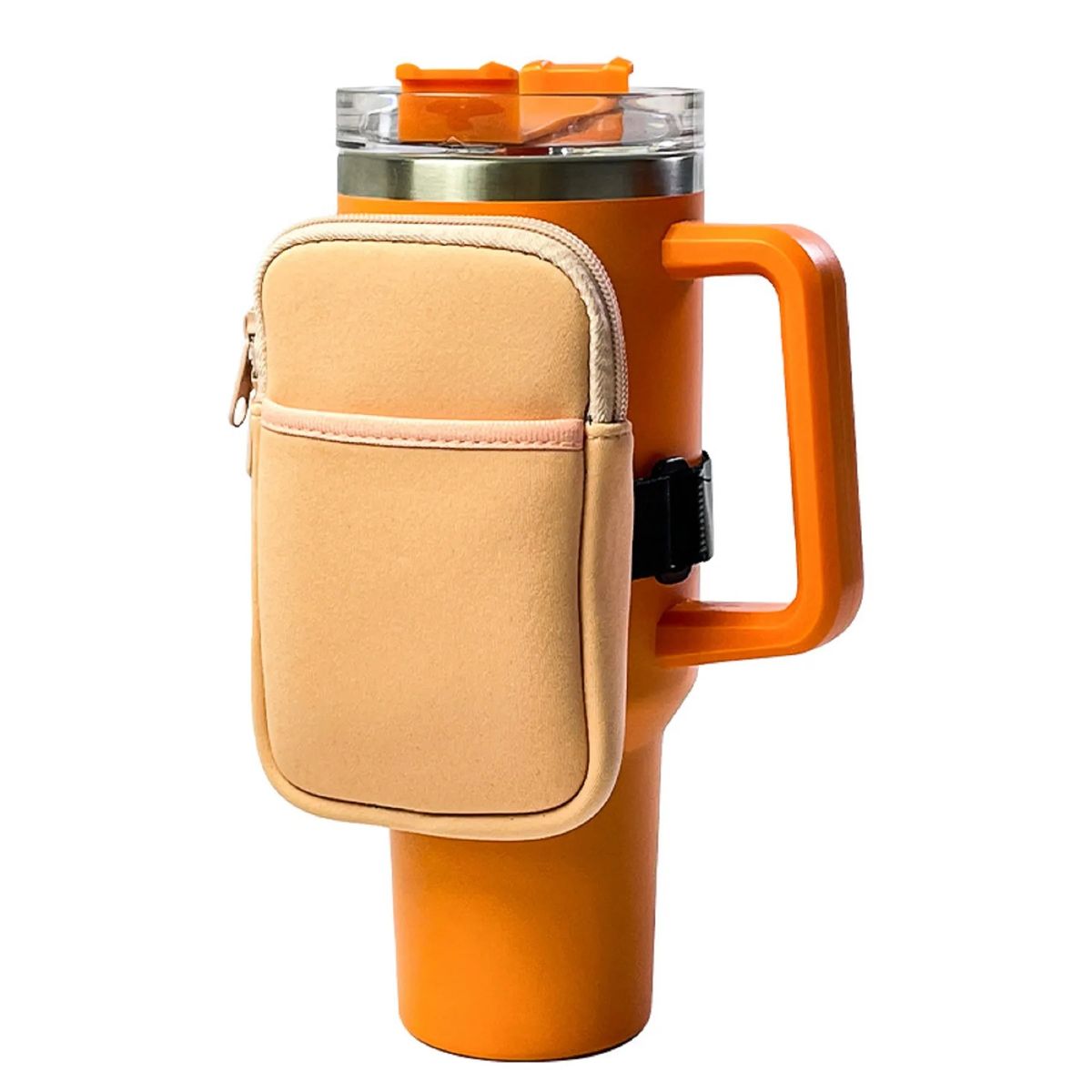 This neoprene arm bag is designed to fit securely around most 40 oz tumblers with handles (Stanley-style, Simple Modern, Hydrapeak, etc.). The front dual-pocket pouch safely holds your phone, cash, cards, keys, earbuds, or small essentials, making it the perfect accessory for on-the-go lifestyles.