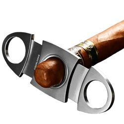 This cigar cutter features an exceptionally sharp, high-quality double-bladed design, much like a guillotine, effectively preventing loose tobacco from breaking off when cutting the end of a cigar. This ensures the correct cut depth, allowing for proper airflow and fully releasing the cigar's optimal flavor. Made of polished stainless steel, this double-bladed guillotine-style cigar cutter features self-sharpening blades for precise cuts. Say goodbye to the embarrassment of biting off the end of a fine cigar and fully enjoy its rich aroma! The sharp blade cleanly and neatly cuts the cigar end with just a gentle press of your finger. With its durable construction and stylish design, this cigar cutter also makes a delightful gift choice.