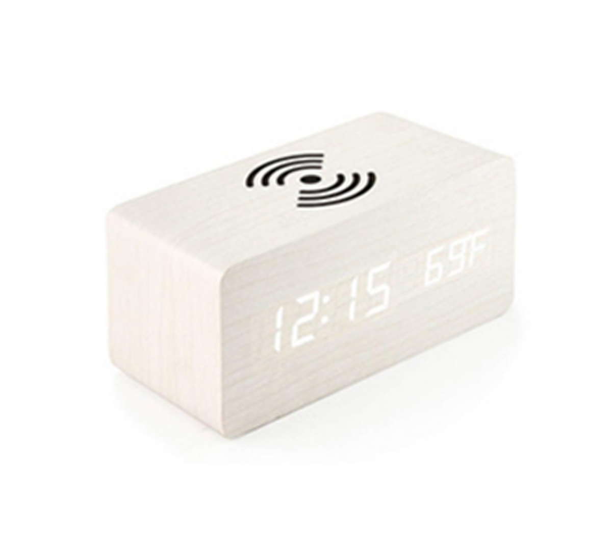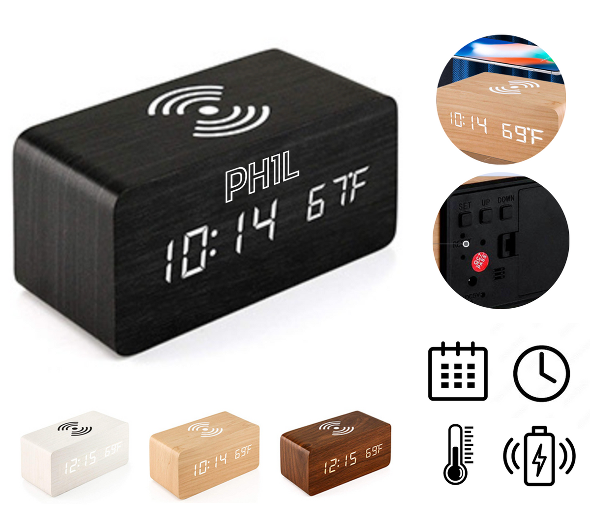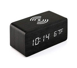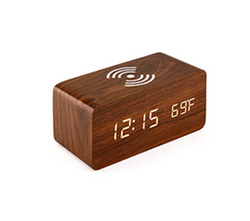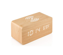 Made of Wooden & LED Light. The Wooden LED Alarm Clock can display the Time, Date and Temperature through the LED light so you can know them clearly. Also there is a wireless charger so you can charge your phone while sleeping. You can charge your Clock with Battery or through the USB port. Also you can adjust the display light to meet different needs. 6.28"x2.75"x2.75"