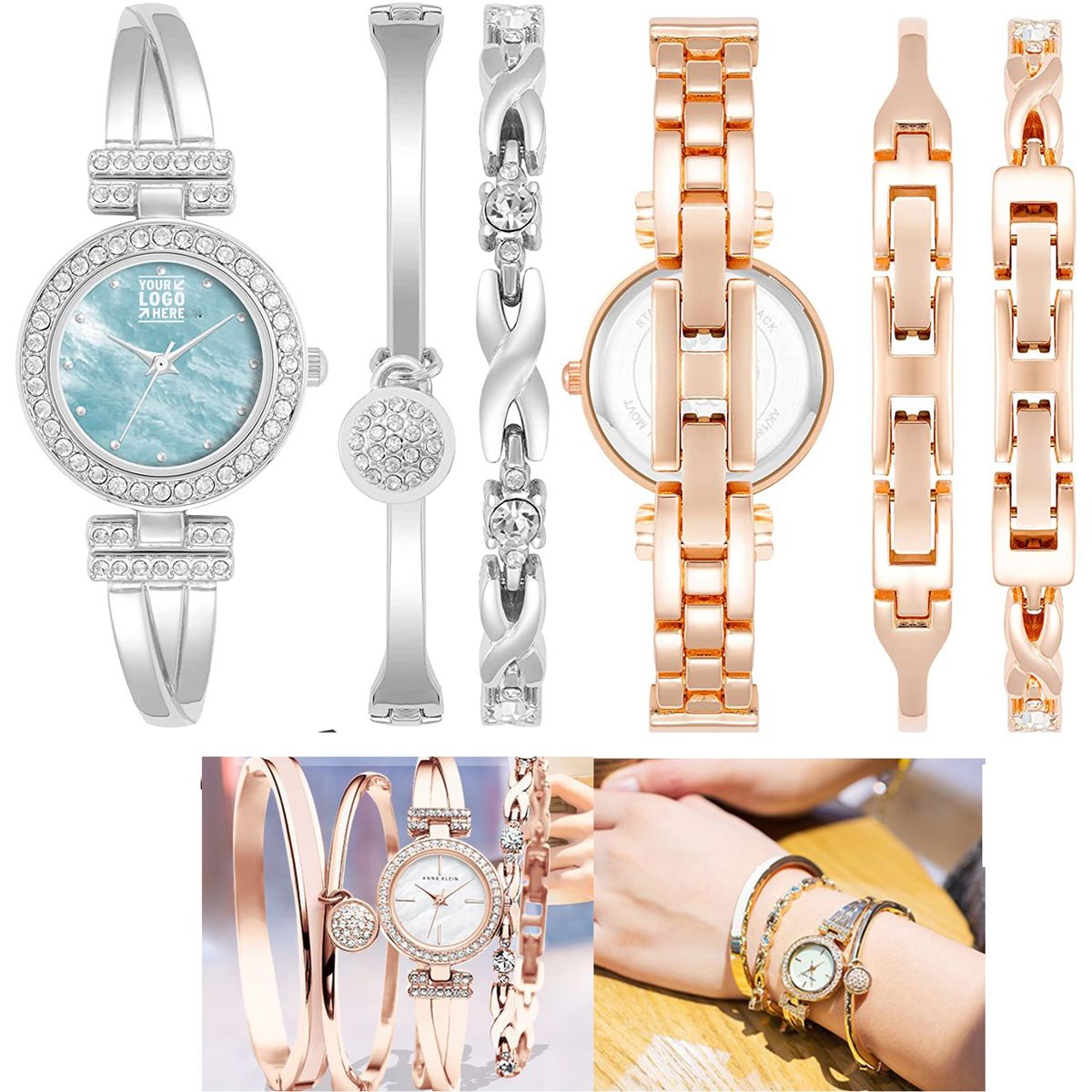 Mineral Dial window material. Mother of pearl. Set includes a gold-tone bangle with premium crystal-accented charm and a link bracelet with round premium crystals.