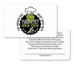 These full color plastic cards are perfect for use as membership, discount, loyalty and informational cards, and for many other purposes. (Like breaking back into your car after you left the keys on the passenger seat....again!) With a .030" thickness and lamination on both sides, these cards are durable and look sharp with a credit card feel. Printed with crisp digital graphics on the front, they also offer the option of full color printing on the second side. 5 working days up to 500 pieces.