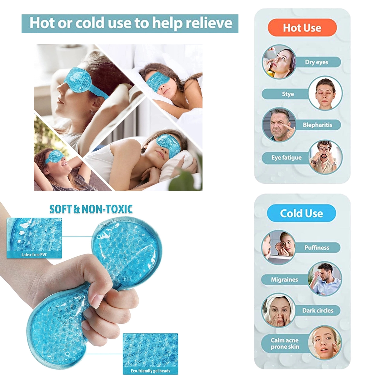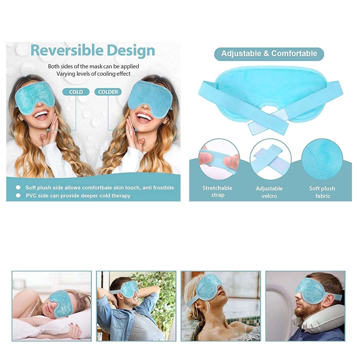 This hot and warm eye mask is made with medical grade plastic on one side and soft plush fabric on the other side to ensure optimal safety as you sleep. The soft plush side allows direct-skin use and provides spa-like experience, or choose the plastic side for direct colder experience.With an adjustable head strap,this hot and cold eye mask is sure to fit perfectly on all different head shapes and are suitable for women, men, kids.Just simply put the eye compress in the freezer for 2 hours for cold therapy or heat it in the microwave for 10s for heat therapy. Use the plush side for a cool experience or the plastic side for colder experience.Whether you are looking for relief from puffy eyes, migraine, headache, or just to relax, this eye mask is here to help!