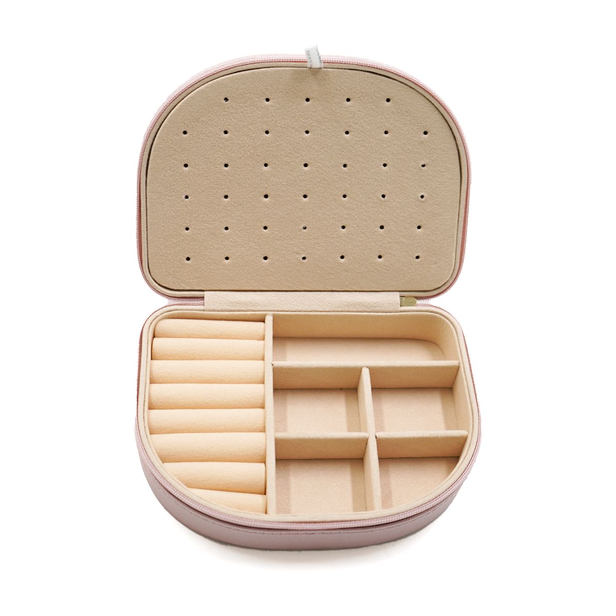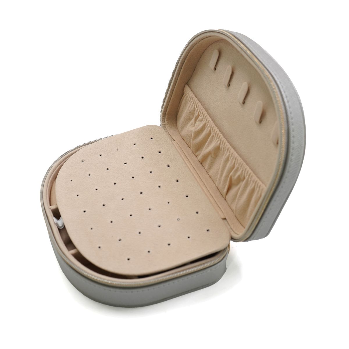 This semi-round jewelry case is made from PU material with a textured surface that resists moisture and light splashes. The interior features soft lining with padded sections that help protect rings, earrings, necklaces, and small accessories from scratches. A perforated panel holds multiple pairs of studs, while divided compartments organize various items neatly. The sturdy body maintains its shape and supports moderate pressure, making it suitable for daily storage or travel use. The zipper closure operates smoothly and helps keep the contents secure. Its compact size fits easily in drawers, handbags, or luggage, offering a practical way to store and access small valuables in different settings.