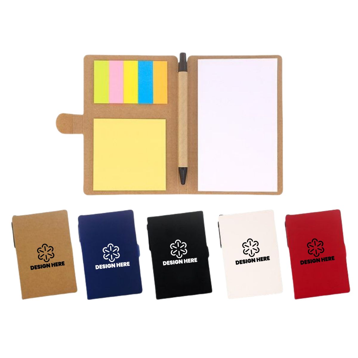 One book to hold all of the different sized sticky notes that you need. The perfect product for schools and offices.Matching pen has paper barrel. Sticky flag notes in 5 neon colors. You can put your logo on the cover, advertise your brand. Promote your brand and a clean environment with this all-in-one ecofriendly gift!