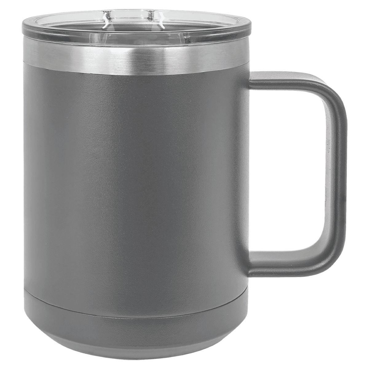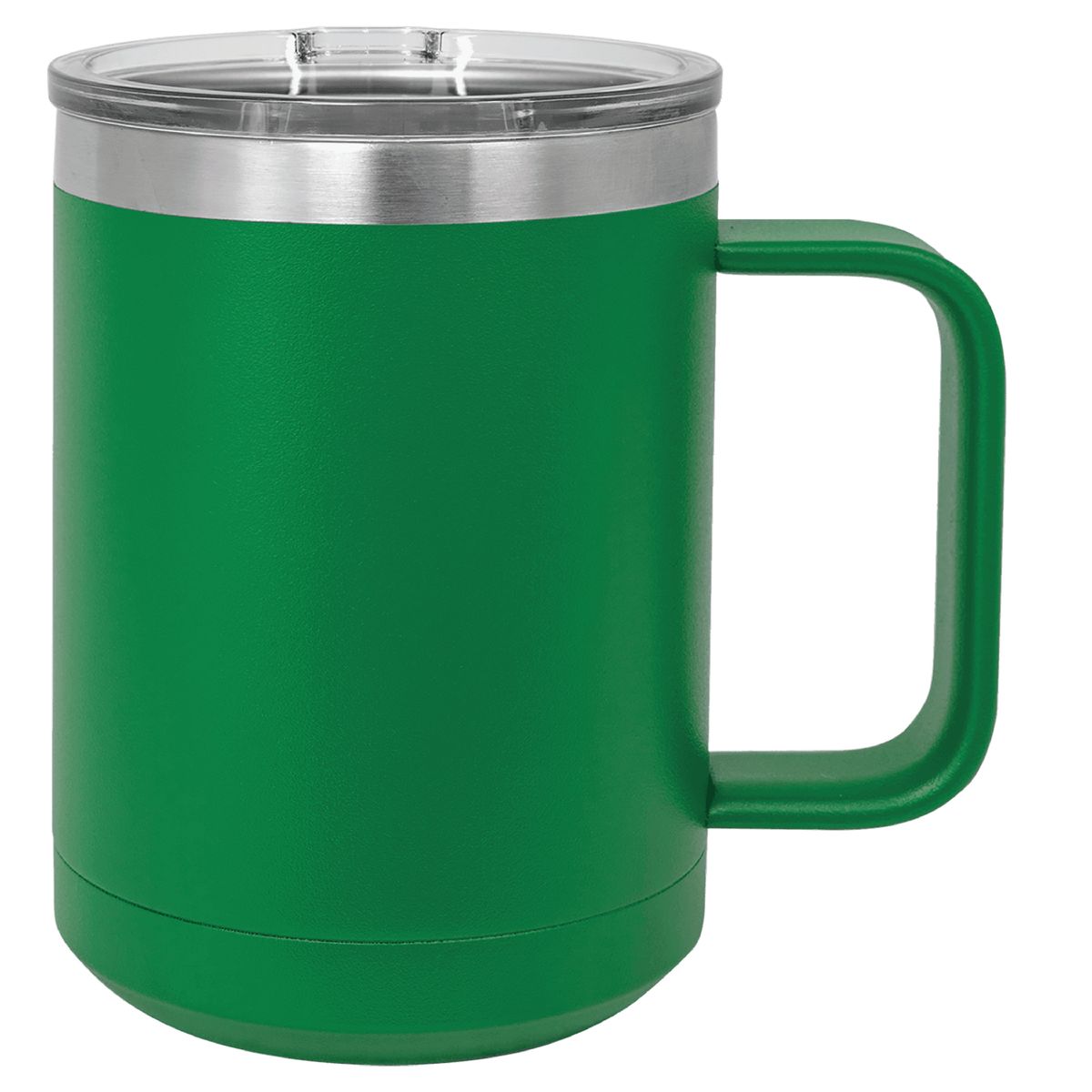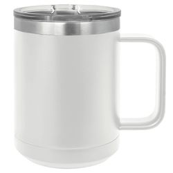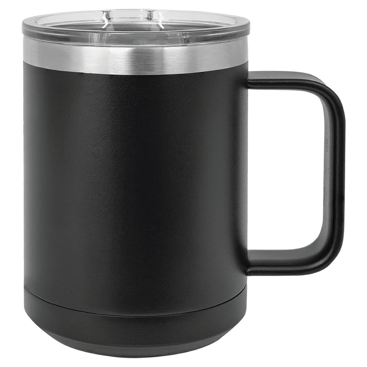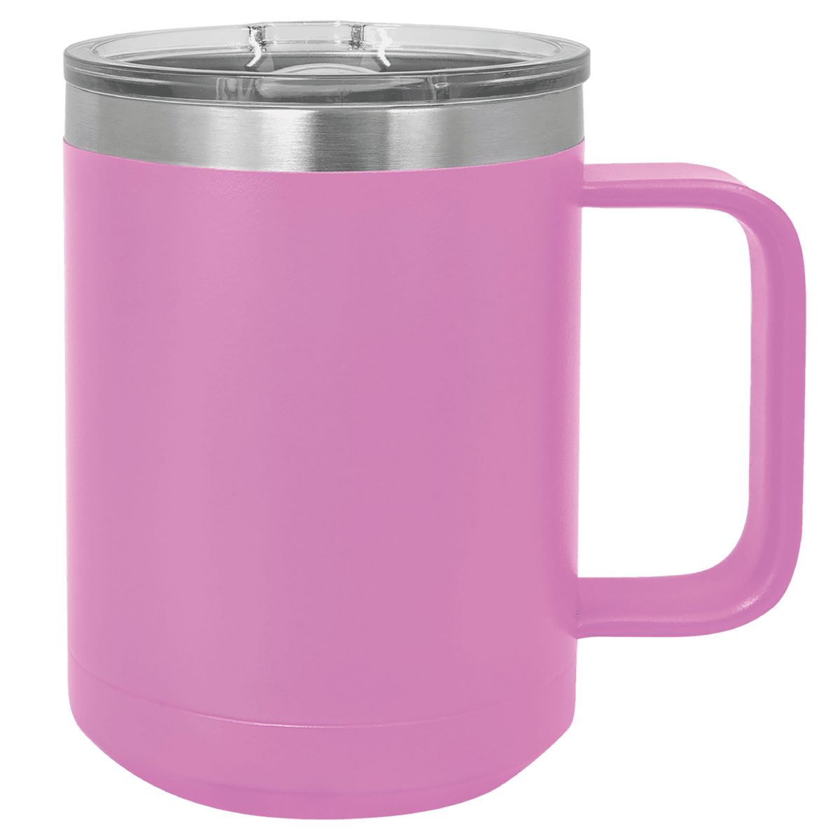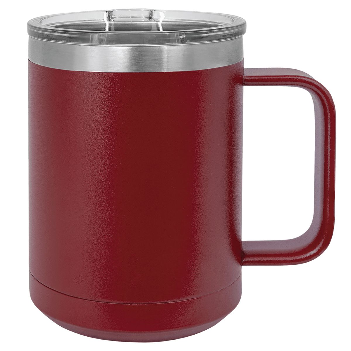 Polar Camel 15oz coffee mugs are made of double-wall vacuum insulated stainless steel with a wide handle and clear sliding sip-through lid. Double insulated keeps drinks hot or cold for hours! Select from 18 dynamic colors and shades and add your school, sports team, organizational or company logo through our signature laser engraving process to create a bold branded giveaway for marketing and social activities and events. Individually packaged. Optional magnetic or snap lids are available.