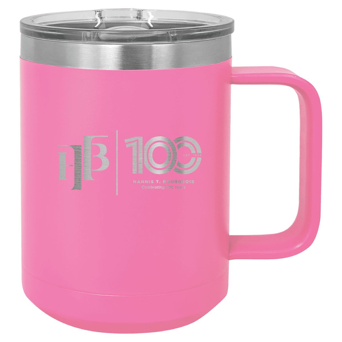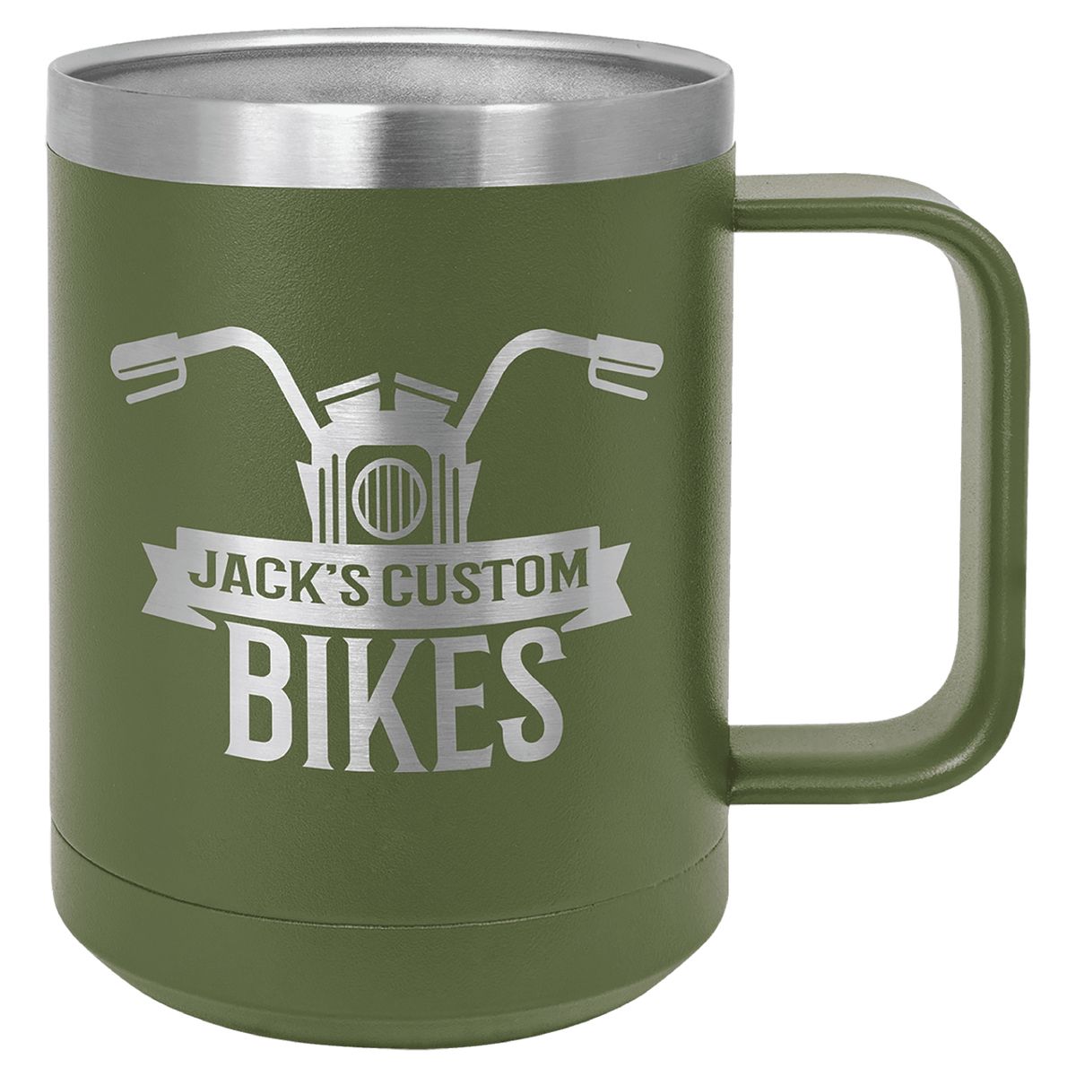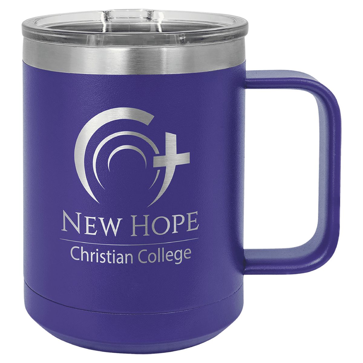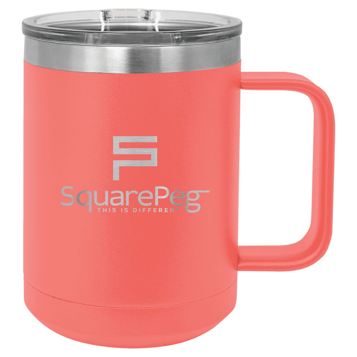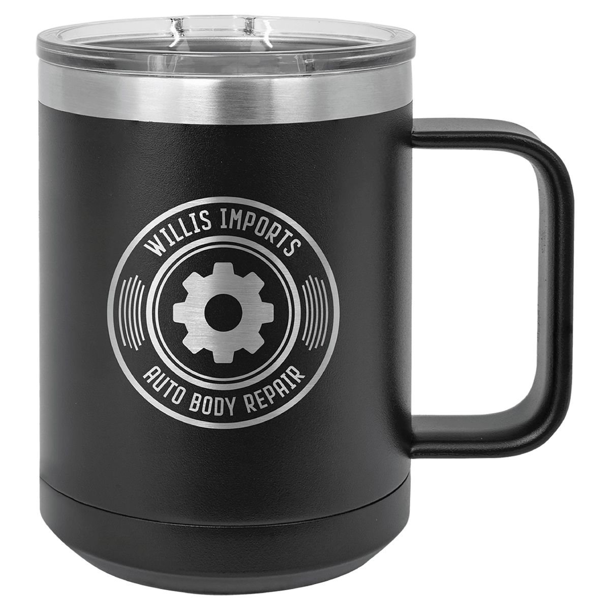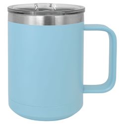 Polar Camel 15oz coffee mugs are made of double-wall vacuum insulated stainless steel with a wide handle and clear sliding sip-through lid. Double insulated keeps drinks hot or cold for hours! Select from 18 dynamic colors and shades and add your school, sports team, organizational or company logo through our signature laser engraving process to create a bold branded giveaway for marketing and social activities and events. Individually packaged. Optional magnetic or snap lids are available.