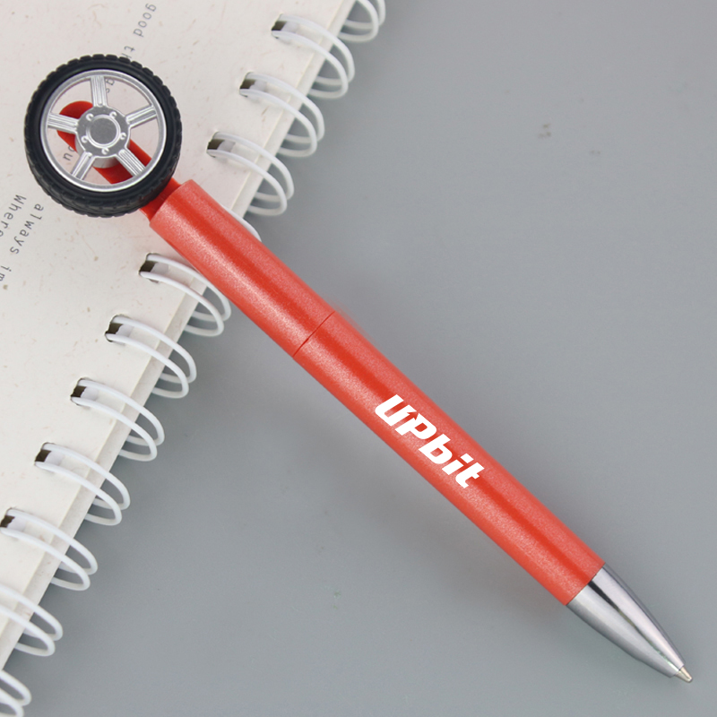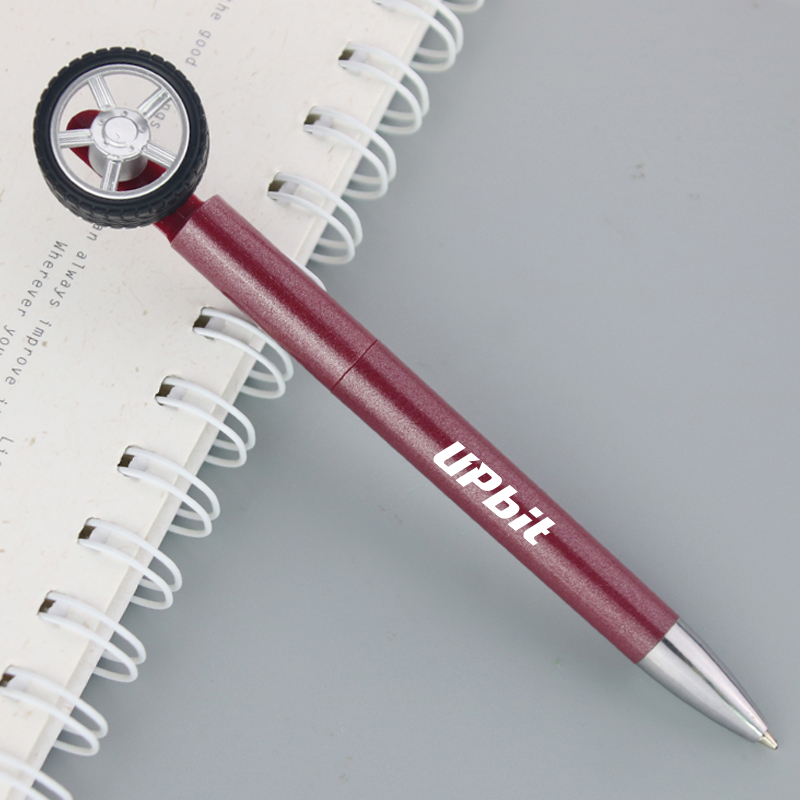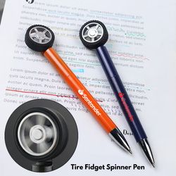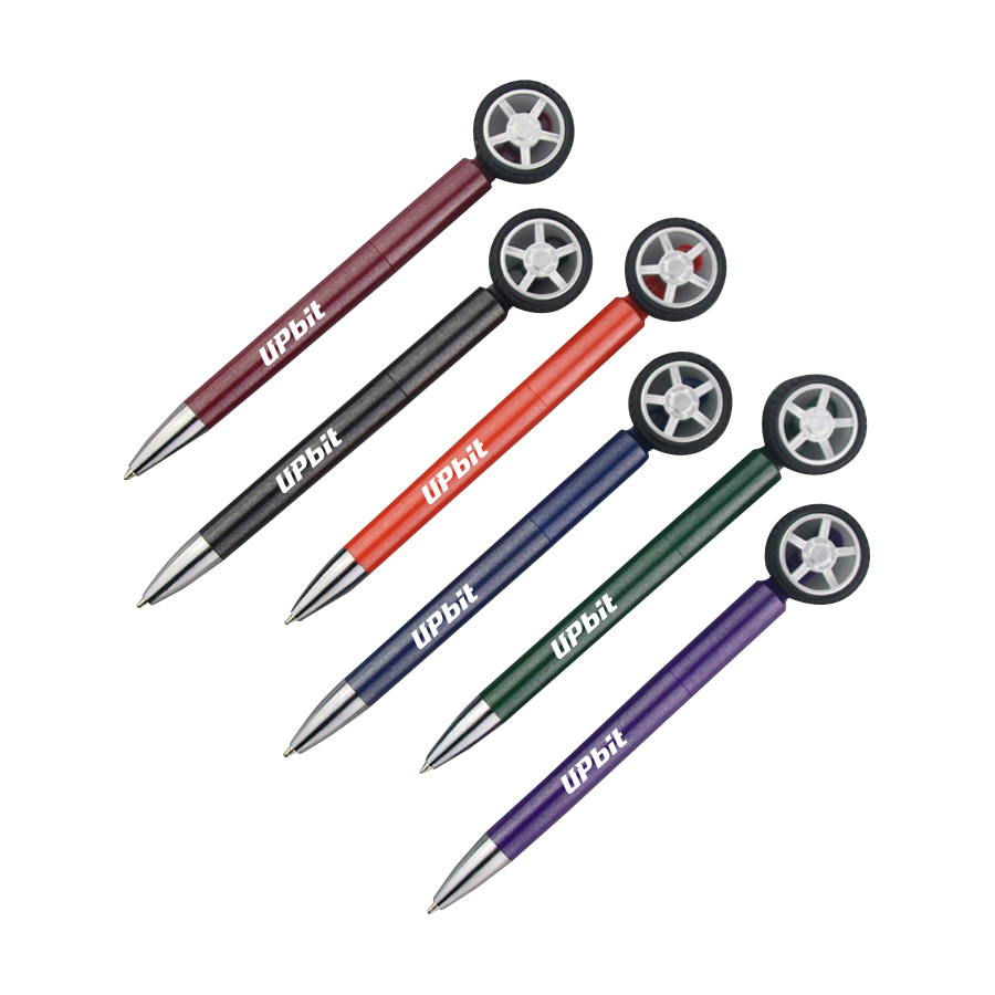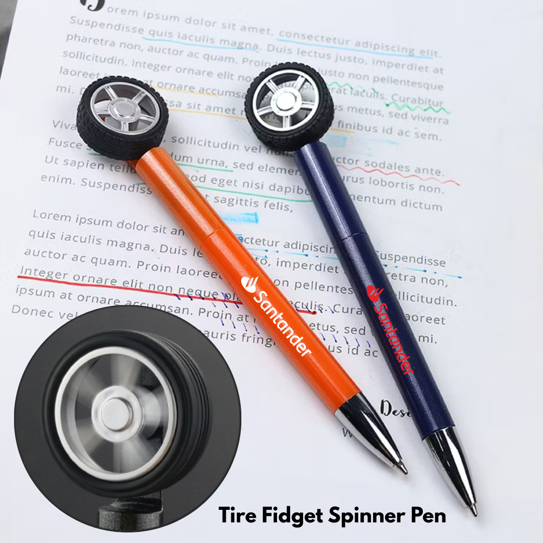 This fun and functional pen features a built-in tire-shaped fidget spinner. Designed for stress relief and smooth writing, it uses 1.0mm black ink and comes in bold colors: black, green, orange, purple, blue and dark red. A unique choice for auto promos, schools, and giveaways. Weight: 10.1g.