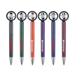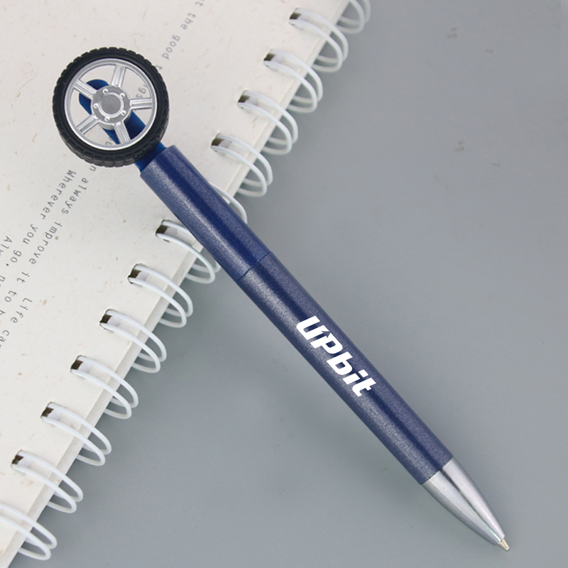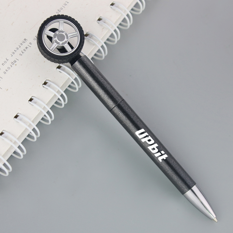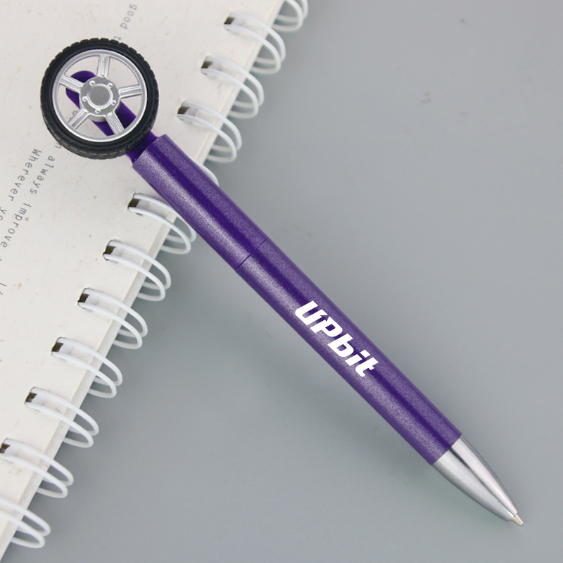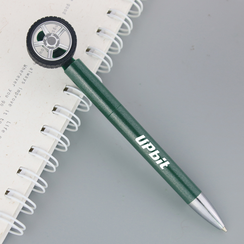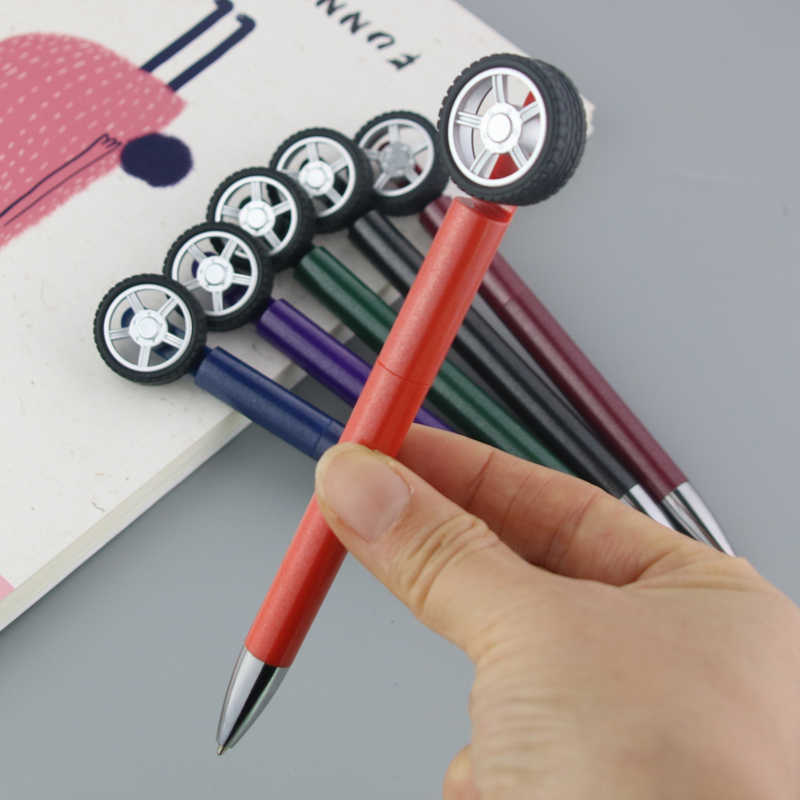 This fun and functional pen features a built-in tire-shaped fidget spinner. Designed for stress relief and smooth writing, it uses 1.0mm black ink and comes in bold colors: black, green, orange, purple, blue and dark red. A unique choice for auto promos, schools, and giveaways. Weight: 10.1g.