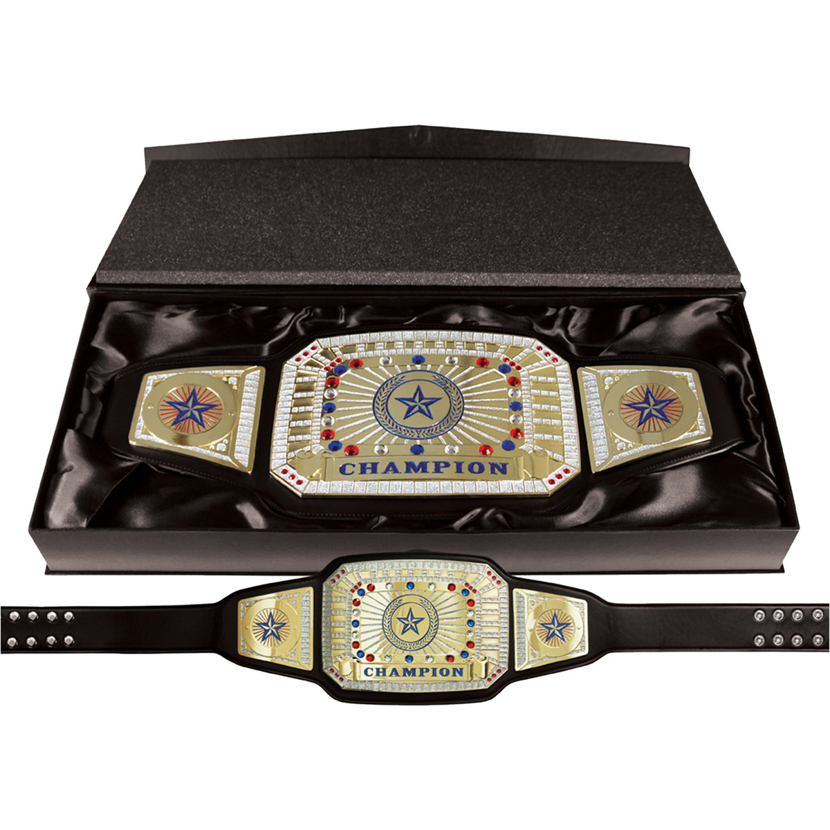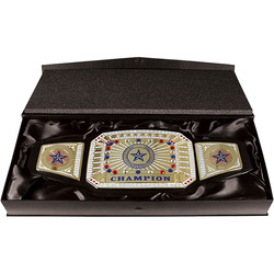 You can't go wrong with our original “CHAMPION" championship belt! This 52" leather belt features a large main plate with glitter enamel and synthetic gemstones. 8 rows of heavy duty snaps keep this big boy well fastened and secure. Each belt is packaged in an individual box with satin lining.